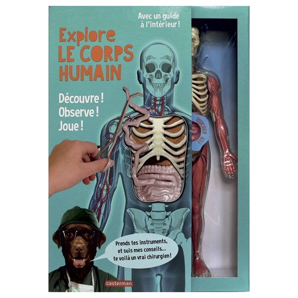 Une maquette transparente du corps humain, haute de 32 cm, sur son socle. Les os, les muscles et les principaux organes sont amovibles et repositionnables. Instruments de chirurgie fournis.